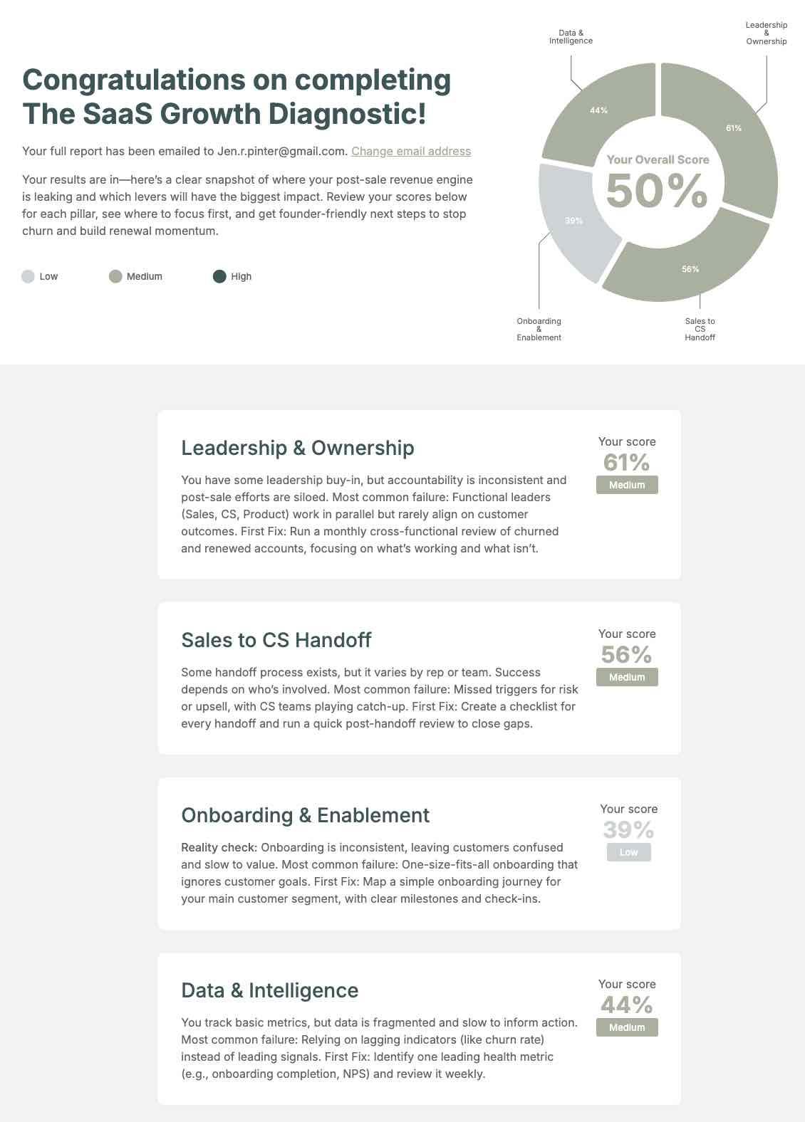 Instantly see your overall and pillar-specific scores, get expert feedback, and discover your highest-leverage improvement areas—so you stop relying on heroics and start building predictable, scalable systems.